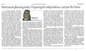 In the article, “Retirement planning today: Preparing for independence, not just the future,” McLeod analyzes the trends and common questions she has noticed in the realm of retirement planning and finances. “I am seeing is the growing number of people who are preparing earlier,” she writes. “While traditional pensions have become less common, individuals are making use of hybrid insurance products and riders that add flexibility to their retirement strategies.”